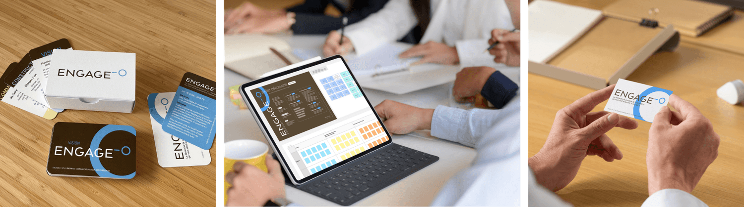 Un programme qui vous plonge dans l'action avec des ateliers rythmés par le jeu de cartes ENGAGE-O permettant de repartir avec de nouveaux réflexes + votre stratégie du changement.