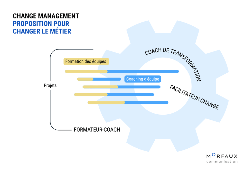 On sort les experts change des projets et on mise sur le développement de compétences de toute l’équipe projet. Objectif : le changement devient partie intégrante de la gestion de projet et pas quelque chose qu’on ajoute ou que l’on délègue.